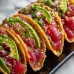 - Assemble the Tacos: Once the taco shells are cooled and crispy, spoon a generous portion of the chilled tuna tartare into each shell. Top with fresh avocado slices, and if desired, garnish with thinly sliced jalapeño or pickled ginger to add an extra burst of flavor and heat. Serve immediately to enjoy the contrast of textures and freshness.