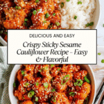 This Sticky Sesame Cauliflower recipe features crispy baked cauliflower florets coated in a luscious, sweet and spicy sesame sauce. Perfect as a flavorful vegetarian appetizer or side dish, it combines a crunchy texture with a balanced blend of soy, sesame oil, ginger, garlic, and a touch of heat from sriracha, finished with fresh garnishes for an irresistible bite.