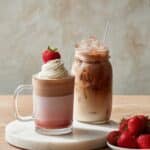 A delicious and refreshing Strawberry Latte that can be enjoyed hot or iced, combining the sweetness of strawberry syrup with rich espresso and creamy milk for a perfect coffee treat.