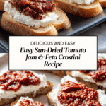 Sun-Dried Tomato Jam and Feta Crostini is a delightful appetizer that combines tangy, sweet, and savory flavors. The rich whipped feta pairs perfectly with the thick, flavorful tomato jam, all served atop crispy toasted baguette slices. It’s an impressive yet easy-to-make dish perfect for entertaining or a special snack.