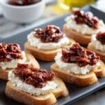 Sun-Dried Tomato Jam and Feta Crostini is a delightful appetizer that combines tangy, sweet, and savory flavors. The rich whipped feta pairs perfectly with the thick, flavorful tomato jam, all served atop crispy toasted baguette slices. It’s an impressive yet easy-to-make dish perfect for entertaining or a special snack.