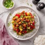- Season and Flour Chicken: Season the bite-sized chicken thigh pieces evenly with salt, pepper, garlic powder, and onion powder. Then coat each piece with flour, ensuring a light, even layer to help with browning and sauce adherence.