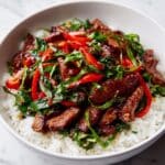 This Thai Basil Beef Stir-Fry is a quick and flavorful dish featuring tender sliced beef sirloin stir-fried with garlic, red bell peppers, and fresh Thai basil in a savory sauce made with soy, oyster, and fish sauces. Enhanced with a touch of brown sugar and optional chili flakes for heat, it’s perfect served hot over fragrant jasmine rice for an authentic Thai meal ready in just 20 minutes.