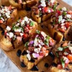 - Assemble the bruschetta: Place the grilled bread slices on a serving plate. Spoon the prepared tomato mixture evenly over each slice.