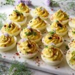This vegan version of deviled eggs uses baby golden potatoes filled with a smooth and creamy tofu-based mixture seasoned with dijon mustard, turmeric, and kala namak salt to mimic the classic deviled egg flavor. The potatoes are boiled until tender, chilled, then topped with a flavorful, eggy tofu filling and garnished with smoked paprika and fresh herbs, making a perfect plant-based appetizer or snack.