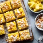 - Serve: Before serving, top the bars with fresh diced pineapple and toasted coconut flakes. Slice into bars and store leftovers in the fridge.