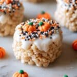 These White Chocolate Pumpkin Spice Rice Krispie Treats combine the classic crispy, marshmallow goodness with warm pumpkin spice flavors and a decadent white chocolate coating. Perfectly shaped like pumpkins and decorated with festive fall sprinkles, they make an irresistible seasonal treat to share with family and friends.